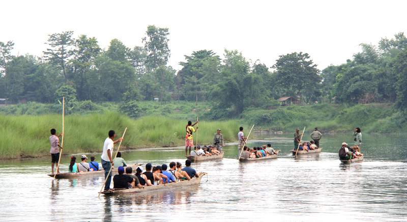 Tourists who go on canoe rides are drawn by the opportunity to paddle alongside the river and get up close and personal with the crocodiles and jungle that line its banks. Another popular tourist destination in Chitwan, Jagatpur, is also reachable by canoe, located about 18 km downstream from Sauraha.