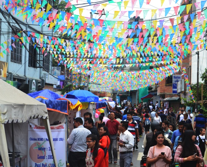 Attendees can enjoy food, handicrafts, face painting stalls, as well as bingo and carnival games for children along the streets of Jhamsikhel during the festival.